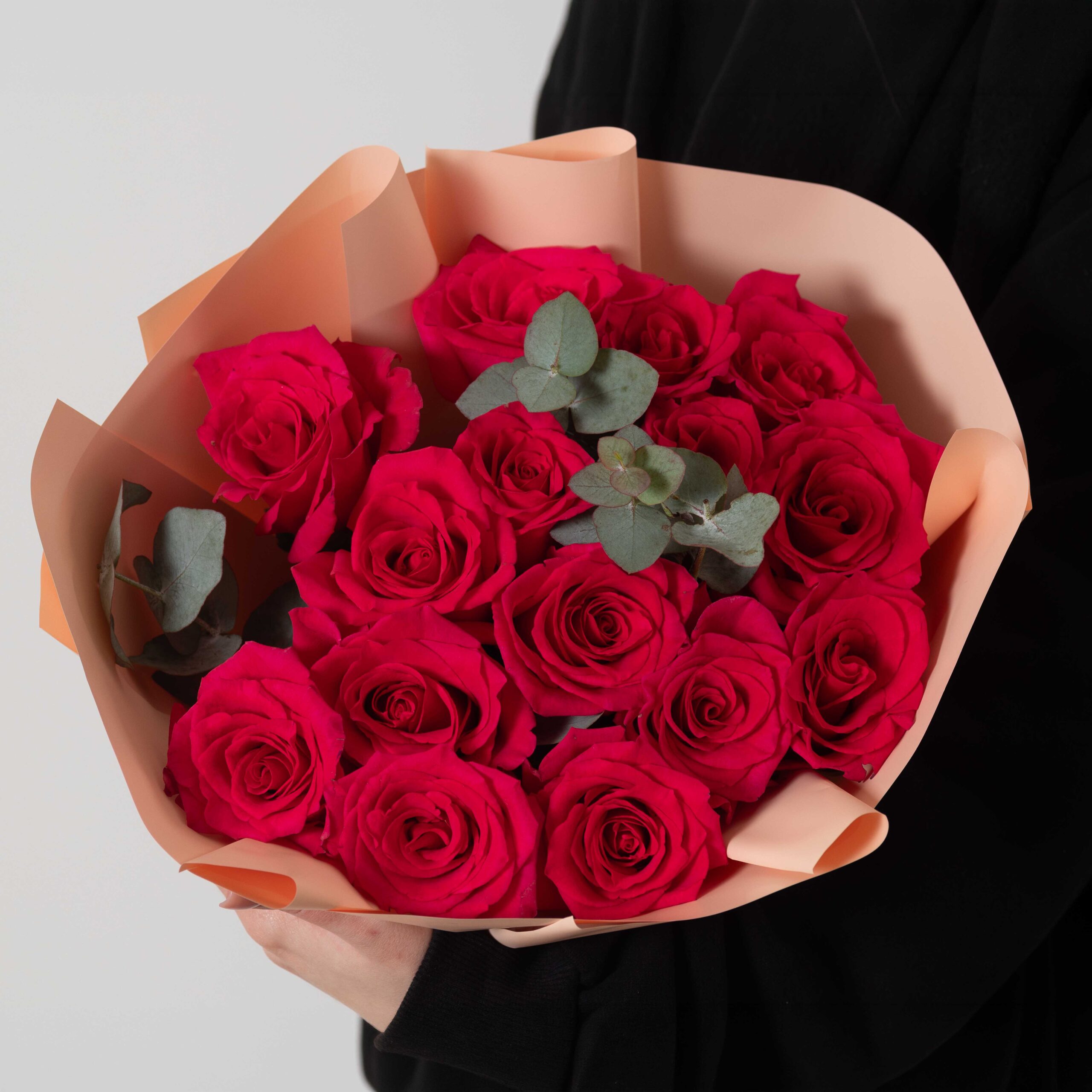 A timeless bouquet featuring 15 red Ecuadorian roses complemented with eucalyptus greenery.