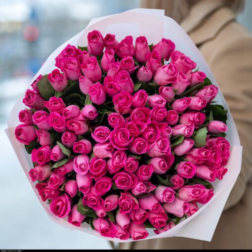 Bouquet of 101 (24) pink Kenyan roses, 35–50 cm in length — an impressive choice for a gift and special occasions.