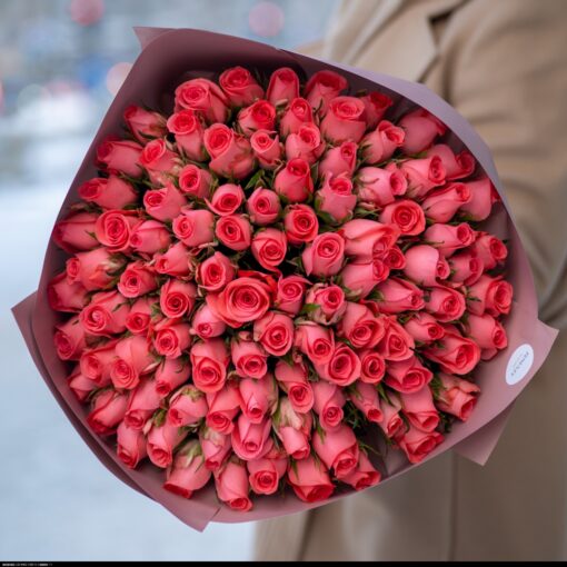 Bouquet of 101 coral Kenyan Sancara roses, 35–50 cm in length — an impressive choice for a gift and special occasions.
