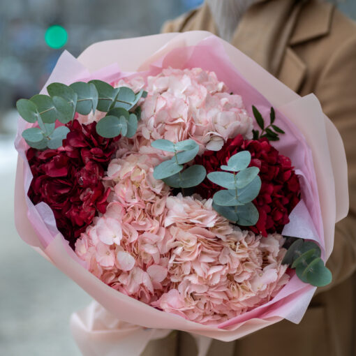 A bouquet of 5 hydrangeas with eucalyptus — a stylish and expressive choice for gifts and special occasions.
