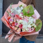 Premium bouquet with anthurium and roses. A voluminous bouquet in soft pink tones with roses, hydrangea and anthurium. Striking and modern.
