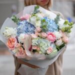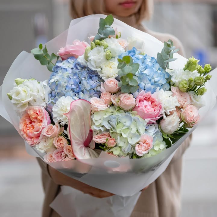 27 pionia, 6 € kappaleelta, ja 2 oksaa eukalyptusta