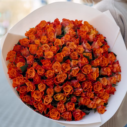 101 oranssia ruusua. Kirkas kimppu 101 ruususta — voimakas väri, energia ja vahvat tunteet.