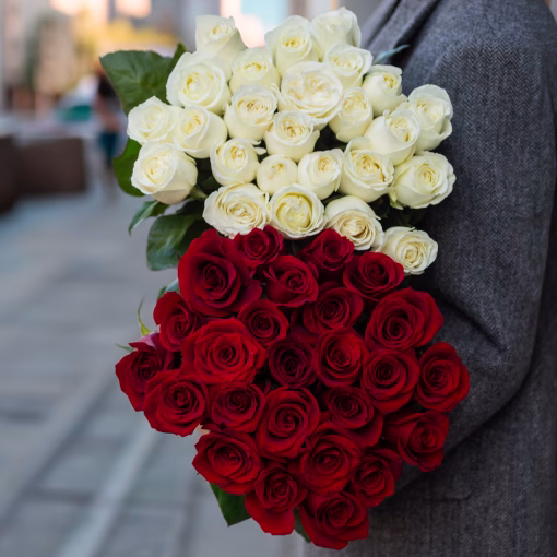 Erikoistarjous: ostaessasi 25 punaista ecuadorilaista ruusua (50 cm) saat vielä 25 valkoista ecuadorilaista ruusua (50 cm) ilmaiseksi.