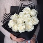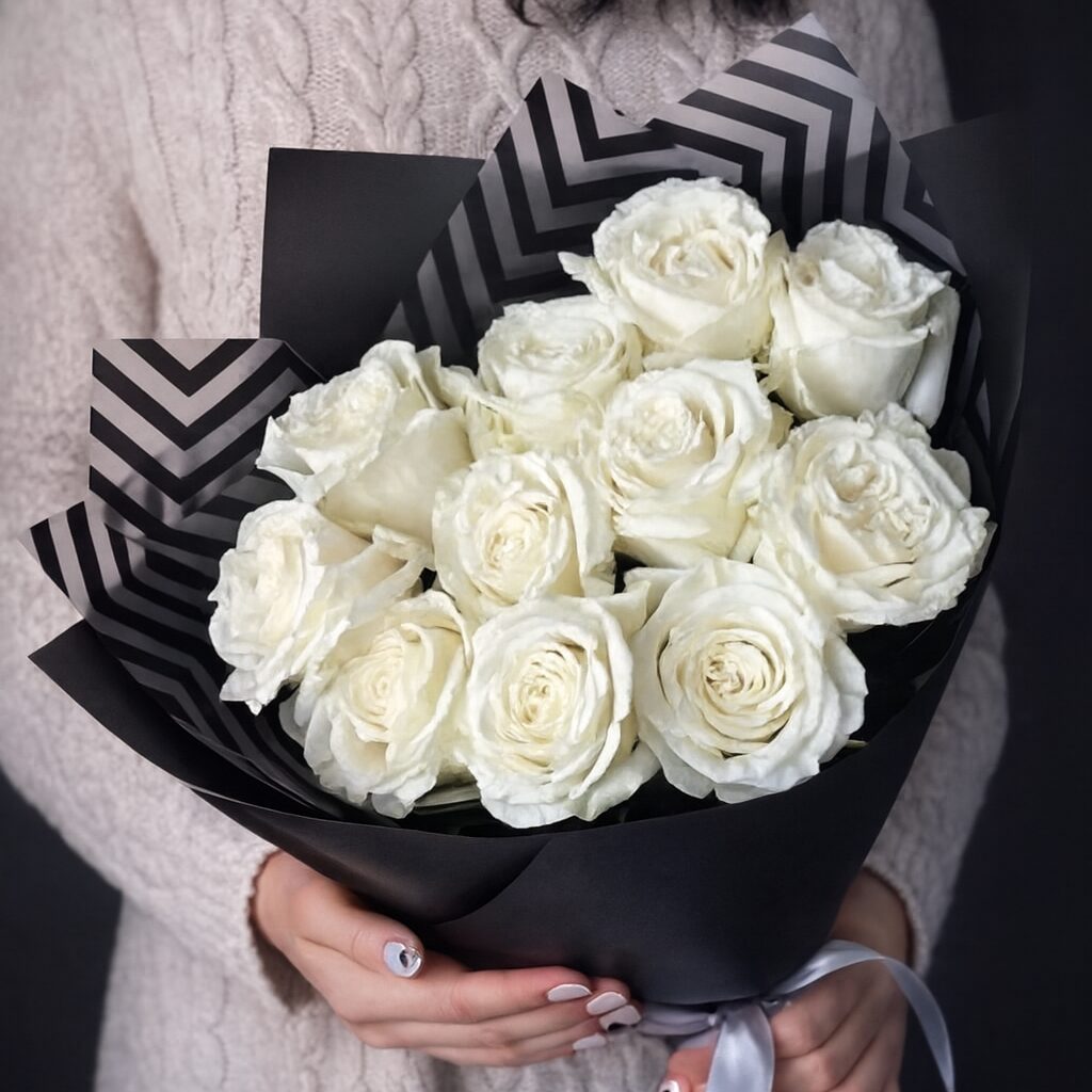 (English) Classic bouquet of 11 white roses, 50 cm tall. We include a complimentary flower card and a pack of a rose life-extending product with each bouquet.