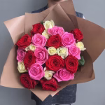 (English) A bouquet of 25 roses of a variety of colours, in a stylish package. The rose height is 50 cm.