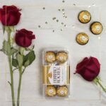 (English) Smooth chocolaty cream surrounding a whole roasted hazelnut within a delicate crisp wafer, all enveloped in creamy milk chocolate and finely chopped hazelnuts